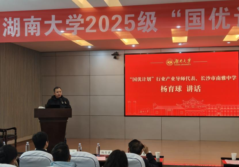 “国优计划”实践导师代表、长沙市南雅中学杨育球老师从一线教学出发,向同学们提出三点期望:涵养教育报国情怀,坚守育人初心;锤炼学科与教学双重本领,实现从知识传授者到思维点燃者的转变;淬炼创新思维,探索新技术背景下的未来教育模式。他表示,行业导师将发挥实践优势,助力学生贯通理论与实际。