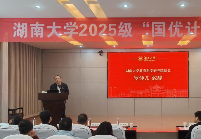罗仲尤院长向新生表示祝贺,向参与培养工作的各院系领导和教师致以敬意。他回顾了湖南大学自1929年设立教育学系的师范传统,表示学院将传承“传道济民、经世致用”的精神,通过优化课程、建强导师团队、强化实习实践等举措,探索综合性大学培养教师教育人才的新路径。他强调,“国优计划”体现了国家对基础教育高水平师资的重视,勉励同学们坚定理想信念、锤炼专业能力,尽快成长为具备“四有”素养的基础教育领军人才。