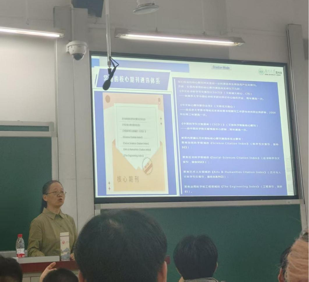 在文献检索方面,晁蓉老师重点演示了“湖图”检索系统与“SPICS学术”平台的使用方法,指导同学们如何高效检索中外文论文与学术资源。她还详细介绍了核心期刊的分类与识别方法,帮助同学们在未来的学术研究中更准确地选择高质量文献来源。